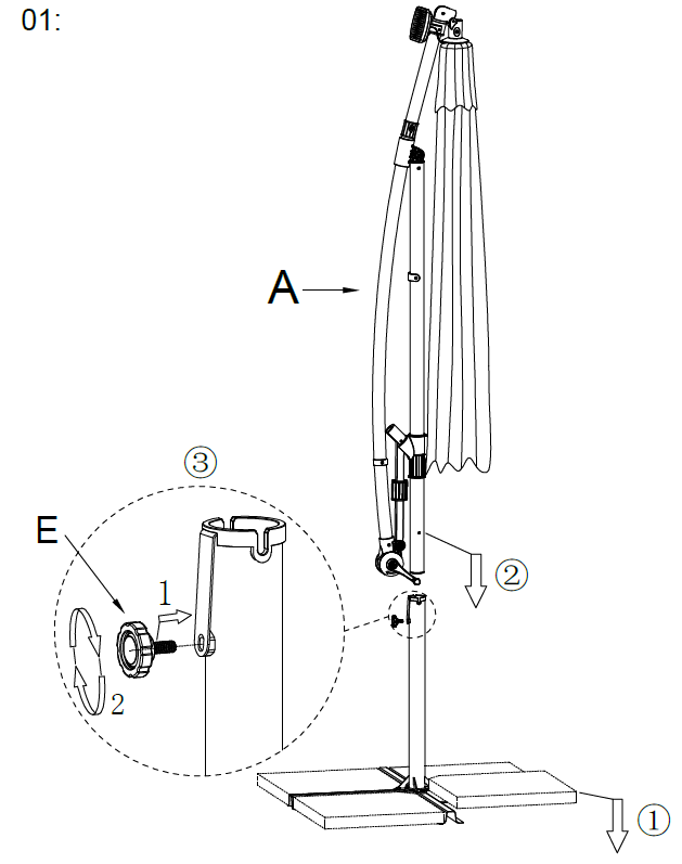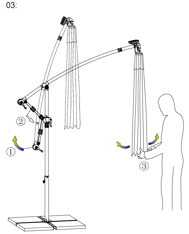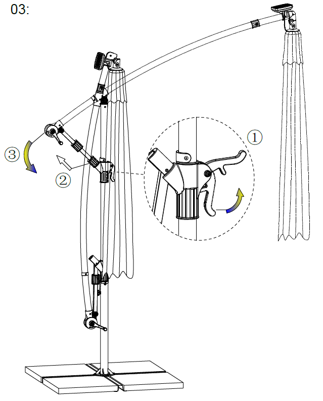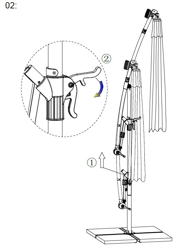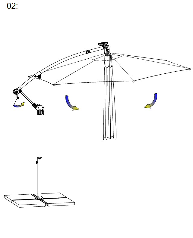 Brug håndtaget (1) til at dreje parasolarmen til den ønskede position.