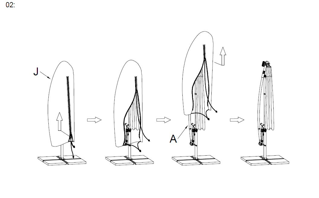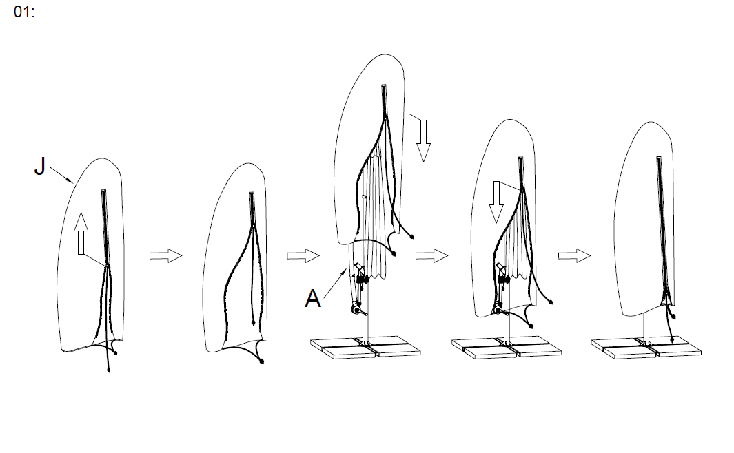 Skub det vandtætte regnslag (Del J) over den sammenklappede parasolbaldakin, og sørg for, at den er helt dækket.