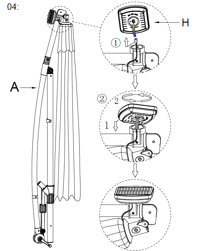 Indsæt LED-lyskomponenten (Del H) i toppen af stålribberne og baldakinen (Del A).