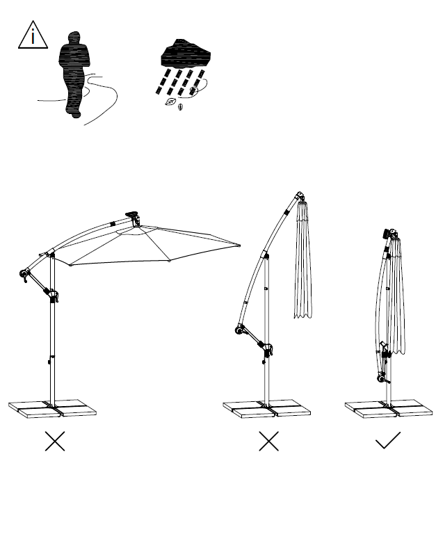Sørg for, at parasollen er i opretstående position, og at alle låsemekanismer er sikret.
