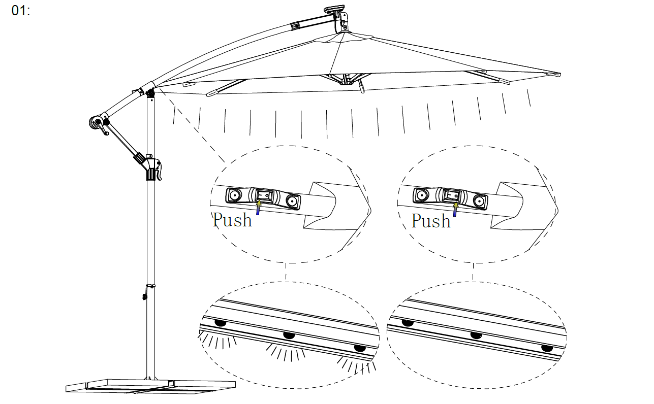 Bygget med en holdbar stålramme og stålribber, har den et let håndsving til glat åbning og lukning. Den 3m polyester baldakin tilbyder god solbeskyttelse, mens de integrerede LED-lys skaber en varm atmosfære til afslapning udendørs efter solnedgang. Den inkluderer også en krydsbase og et sort Oxford paraplyovertræk med lynlås til beskyttelse, når den ikke er i brug.