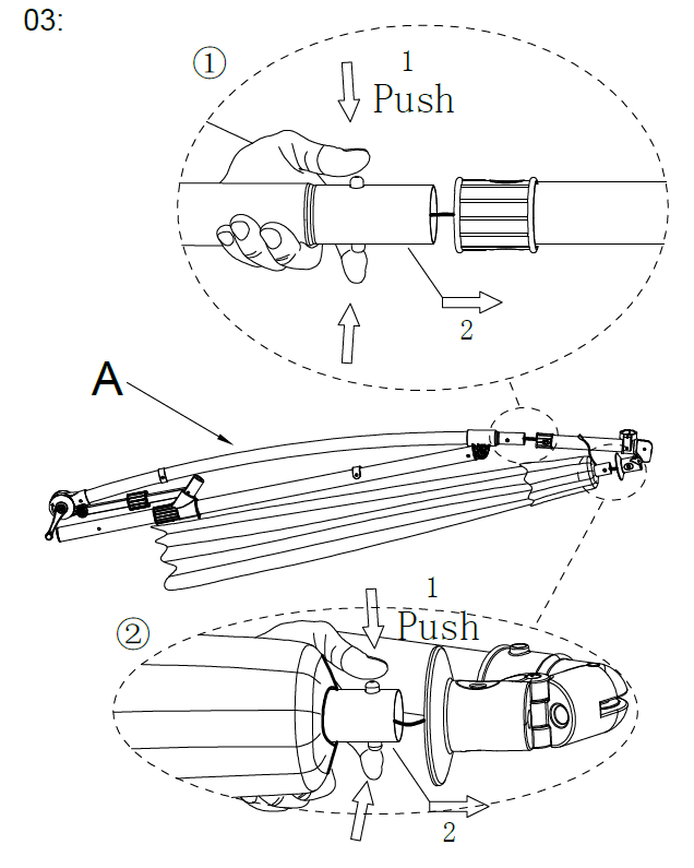 Begynd med at løsne og skubbe det vandtætte regnslag (Del J) opad for at fjerne det fra parasollen.