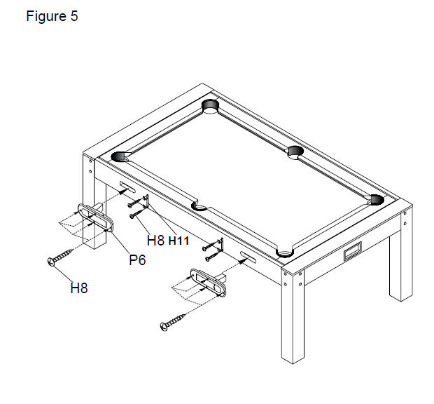 Indsæt træpropper (H9) i de to huller på kanten af bordoverfladedelene (P2) og saml de to dele (se figur 6).