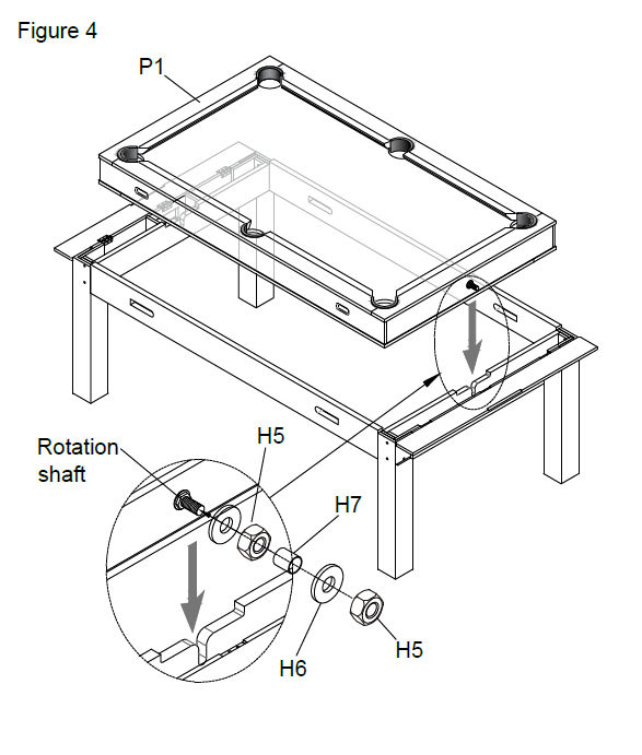 Med hjælp, løft bordoverfladen (P1) ovenpå, og sørg for, at rotationsakslen passer ind i hullet på benende panelet (se figur 4).