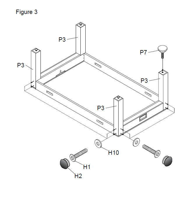 Fastgør hvert ben ved hjælp af M8x15x1 skive (H10), 1-3/4" bolt (H1) og plastikovertræk (H2) i de forudborede huller, som vist i figur 3.