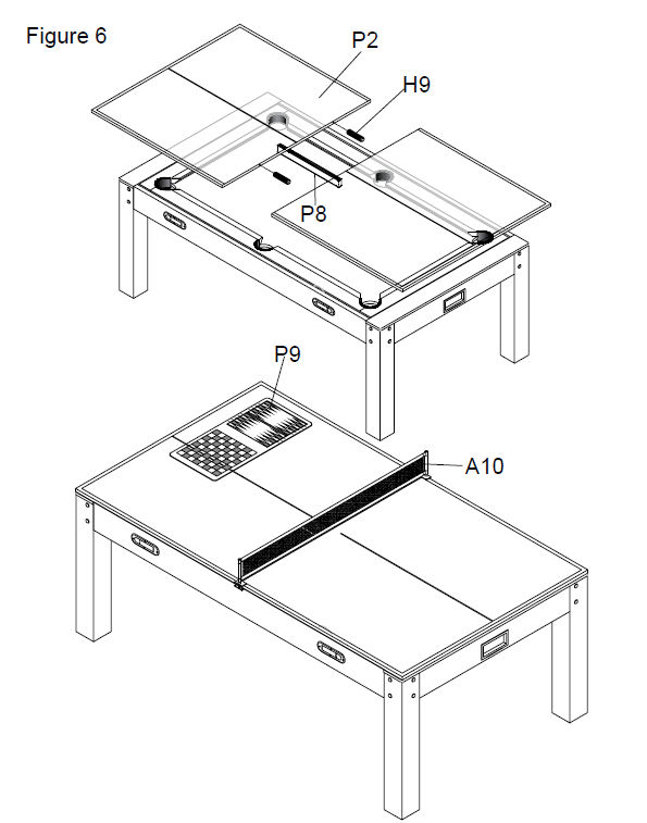 Placer støttebøjlen (P8) på bordet, før du lægger den dobbeltsidede bordoverflade (P2) oven på poolbordrammen. Vælg mellem enten spisebordet eller bordtennisoverfladen.