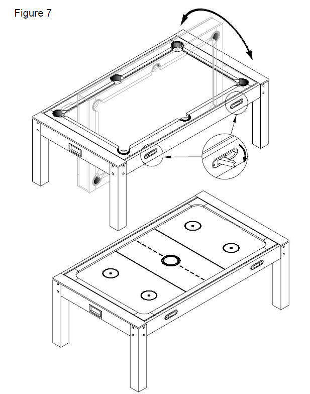 For at skifte mellem airhockeybordet og poolbordet: (Se figur 7)