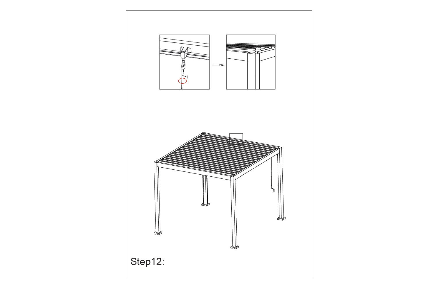5. Opbevaring: Hvis pergolaen skal opbevares i længere perioder, skal den demonteres og opbevares på et tørt sted for at forhindre korrosion og skader.