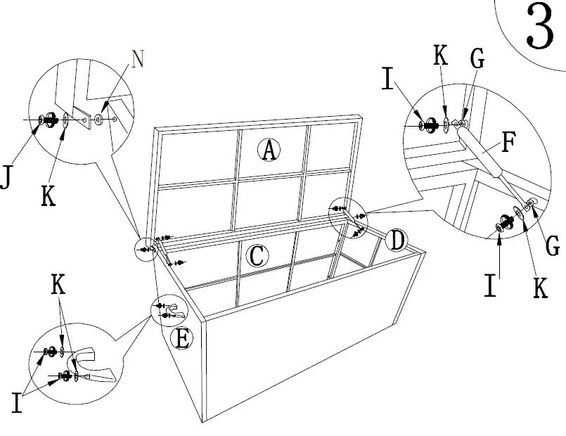 Brug skruer (I) og skiverne (K) til at sikre den.