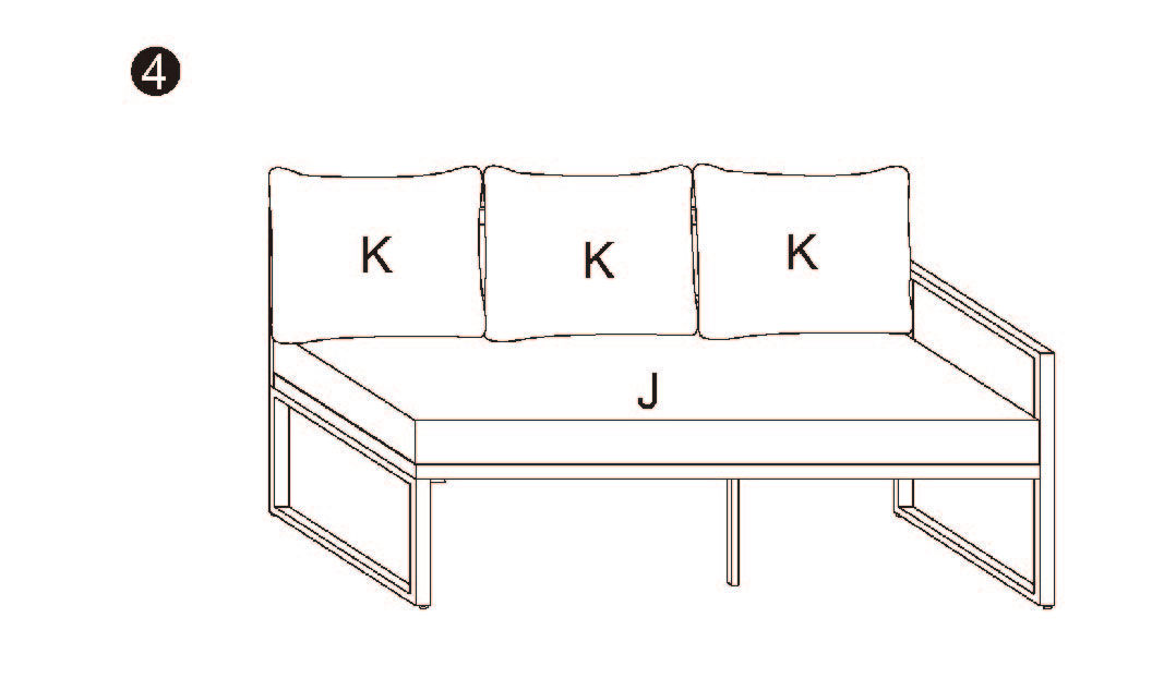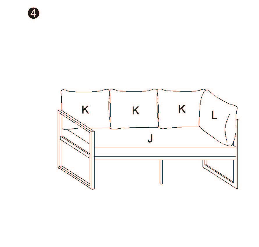 4. Pflege der Kissen: Entfernen Sie die J) Sofasitzkissen, K) Sofarückenkissen und R) Hocker-Sitzkissen regelmäßig und reinigen Sie sie gemäß den Pflegehinweisen des Herstellers.