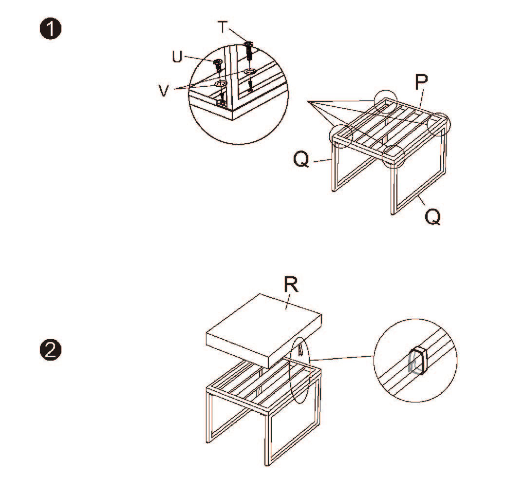 1. Beginnen Sie mit der Montage der Hocker-Sitzplatte (P), indem Sie die Hockerbeine (Q) mit den M6x35mm Schrauben (T) und den Unterlegscheiben (V) befestigen. Verwenden Sie den Inbusschlüssel (X), um die Schrauben festzuziehen.