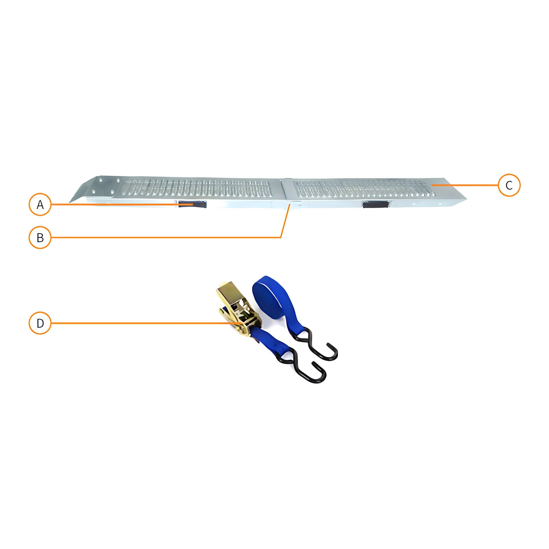 Maximale Höhe: 80 cm Maximale Kapazität: 200 kg Maximale Neigung/Höhenunterschied: 80 cm Entfaltete Größe: 1800 x 225 x 45 mm Nettogewicht: 8,25 kg PartsRampe PVC-Griffe (Vormontiert an der Rampe) Muttern und Schrauben Rampenoberplatte Ratschengurt 1. Produkteigenschaften![]() A. 2 PVC-Griffe für einfachen Transport B. Klappdesign erleichtert das Tragen und Verstauen C. Rutschfeste, gezackte Oberfläche - ideal auch bei nassem Wetter D. Ratschengurt zum Sichern der Rampe beim Be- und Entladen 1. Auspacken und Überprüfen der TeileEntfernen Sie alle Teile der Rampe aus der Verpackung und stellen Sie sicher, dass Sie alles aufgelistete haben: