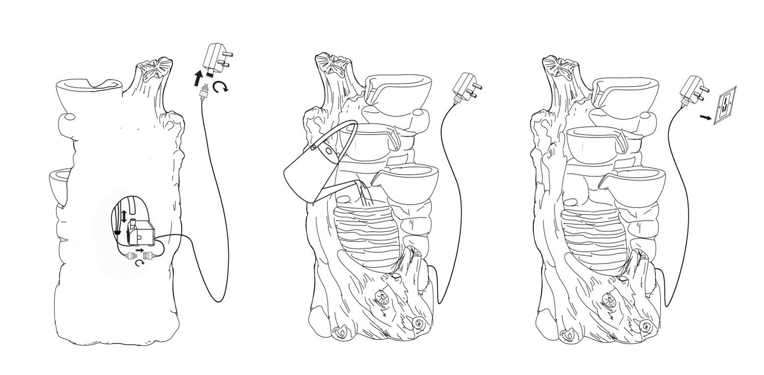 Schließen Sie das Stromkabel an die Steckdose an. Wenn alles korrekt installiert ist, sollte Wasser aus dem Brunnen fließen. Bei der ersten Benutzung könnte sich möglicherweise Luft in der Pumpe befinden; es kann einige Minuten dauern, bis die Luft entweicht.