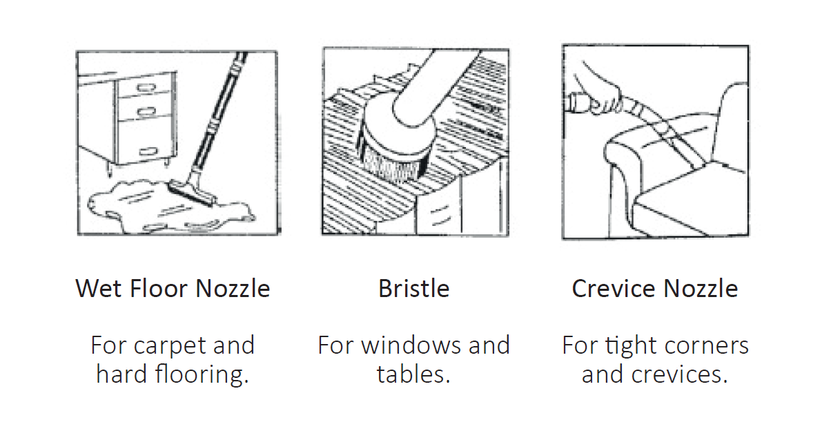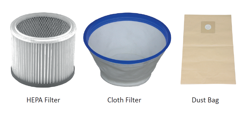 PartsHEPA Filter Dust Bag Cloth Filter Wet Floor Attachment Bristle Attachment Crevice Nozzle Attachment Dry Floor Attachment 1. Step OneInsert the hose connector into the air inlet mouth. Make sure the connector is securely fastened. 2. Step TwoCheck the dual filter is in place for dry vacuuming. If you are wet vacuuming, remove everything from the drum. Place the power cord right at the back of the drum when in use. If you wish, before dry vacuuming, you can add the dust bag. 3. Step Three![]() Attach desired vacuum nozzle. 4. Step FourSwitch on at mains, and press ‘On’ button to power up. 5. Drum CleaningIf you have noticed the suction has decreased, the drum is full. To empty: 1\. First you need to switch off at the power supply. 2\. Unfasten the locking knob and lift off the top cover. 3\. Take off the filter bag and clean the dust away from the drum. 4\. When empty, replace the clean filter bag and lock the top cover back into place. 6. Dual Filter Cleaning![]() The Cloth Filter and HEPA Filter should be washed with warm water. If required, you can use a soft cloth to wipe. Remove the filter before cleaning and allow to dry before re-installing. Note: The Dust Bag should not be washed, please ensure you are washing the Dual Filter, not the Dust Bag. |