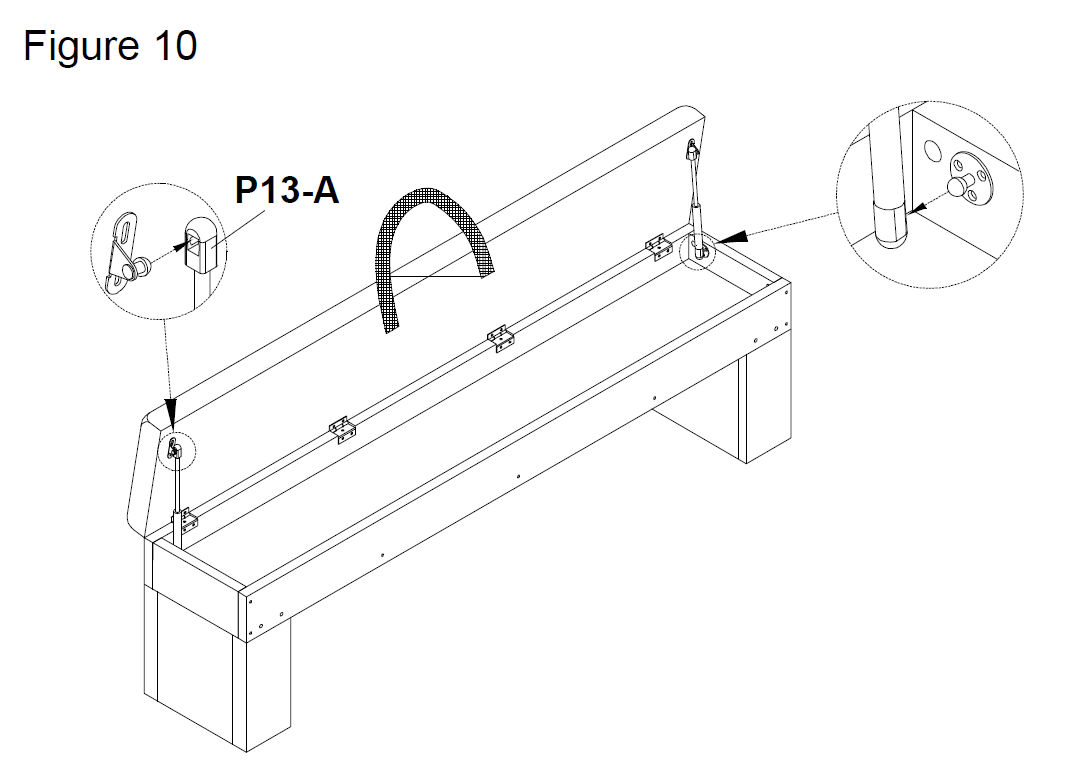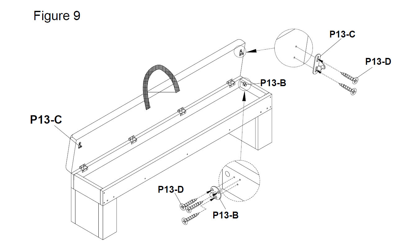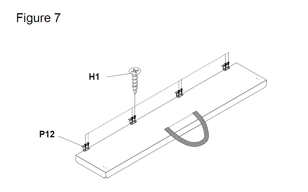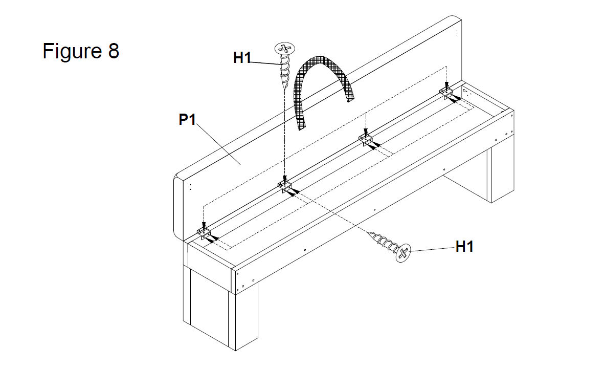 Fix the other side of the hinges (P12) to the bench frame using 15 mm screws (H1)(See Figure 8)
