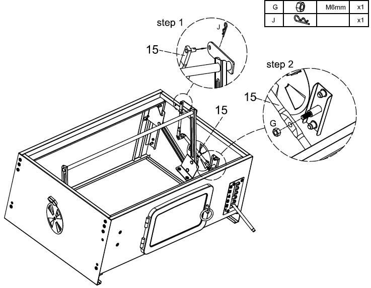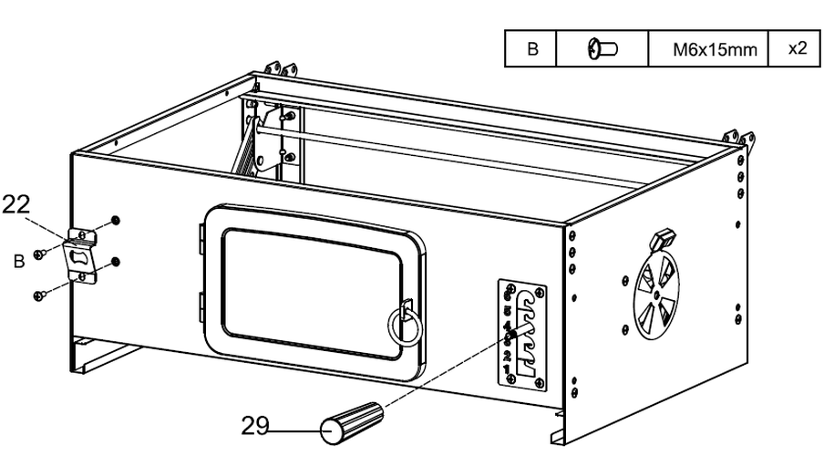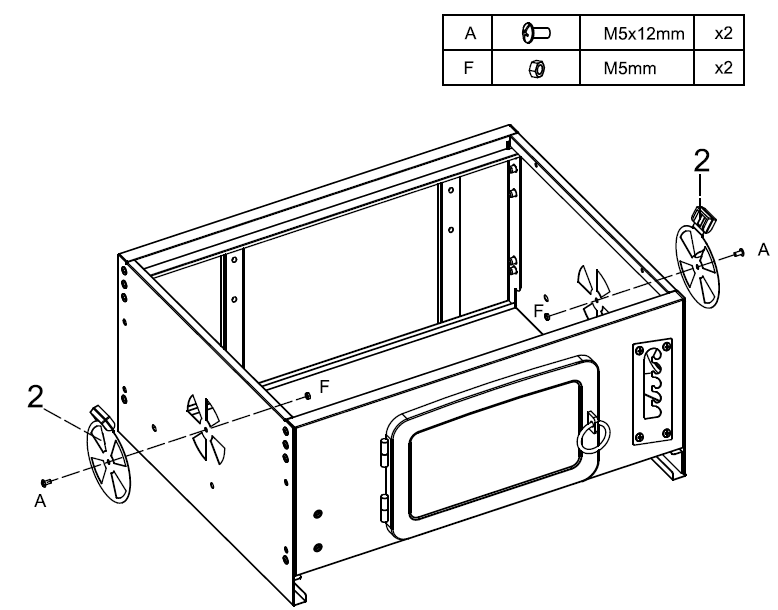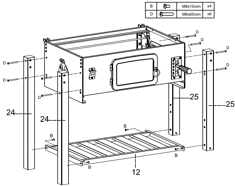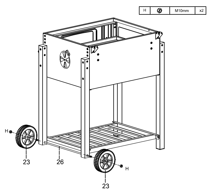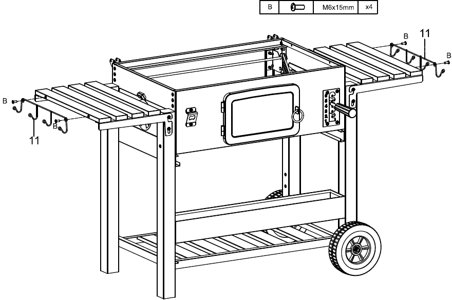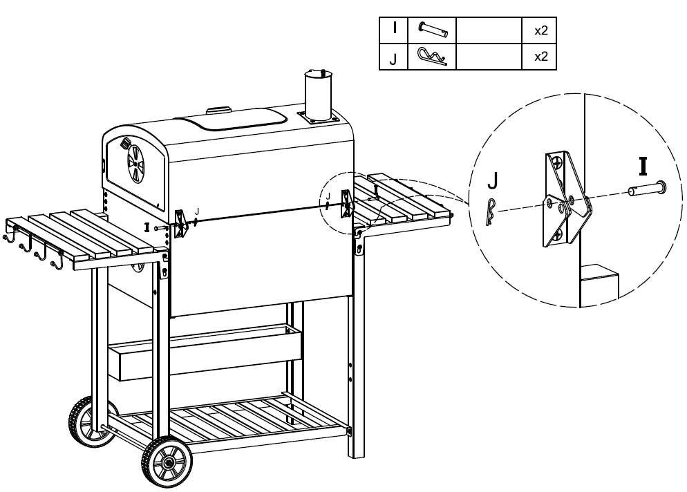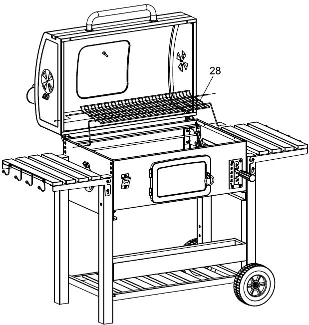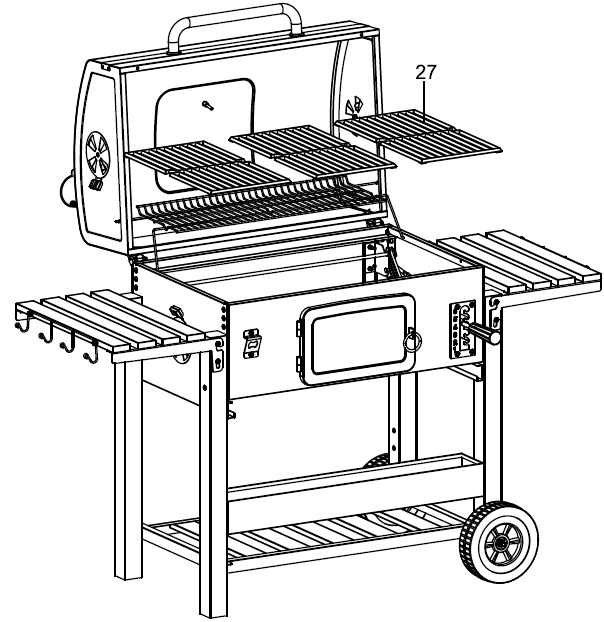 Rana Harvey, Monster Group BV, Van Heemskerckweg 28A & B, Venlo 5928LL, Netherlands, +44134787888 Parts![]() Part 1 - Thermostat ![]() Part 2 - Vents ![]() Part 3 - BBQ Lid ![]() Part 4 - BBQ Lid Handle ![]() Part 5 - Back Panel ![]() Part 6 - Front Panel with Door ![]() Part 7 - Left Side Panel ![]() Part 8 - Right Side Panel ![]() Part 9 - Lower Tray Handle ![]() Part 10 - Side Shelves ![]() Part 11 - Hooks ![]() Part 12 - Lower Shelf ![]() Part 13 - Support Bar ![]() Part 14 - Stainless Steel Tray ![]() Part 15 - Threaded Mount ![]() Part 16 - Chimney ![]() Part 17 - Mounting Bracket ![]() Part 18 - Storage Rack ![]() Part 19 - Lower Tray ![]() Part 20 - Brackets ![]() Part 21 - Brackets ![]() Part 22 - Bracket ![]() Part 23 - Wheels ![]() Part 24 - Left Legs ![]() Part 25 - Right Legs ![]() Part 26 - Support Bar ![]() Part 27 - Stainless Steel Grill ![]() Part 28 - Upper Warming Tray ![]() Part 29 - Adjustable Handle (XL) / Airflow Handle (XXL) ![]() Part A - M5x12mm Bolts ![]() Part B - M6x15mm Bolts ![]() Part D - M6x55mm Bolts ![]() Part E - M6x12mm Bolts ![]() Part F - M5mm Nuts ![]() Part G - M6mm Nuts ![]() Part H - M10mm Nuts ![]() Part I - Pin Bolt ![]() Part J - Pin ![]() Part K - Wing Nut ![]() Part M - M6 Wrench ![]() Part N - M10 Wrench 1. Step 1 - Attach the Side Panel to the Mounting Bracket![]()
