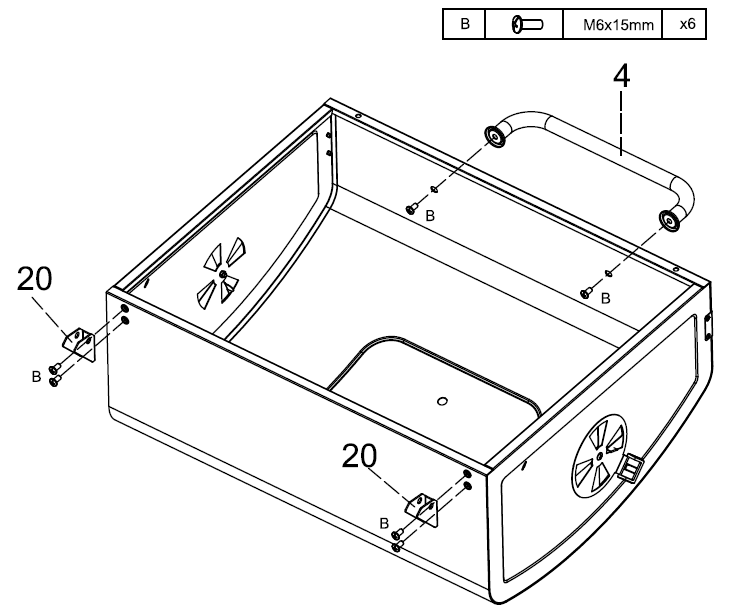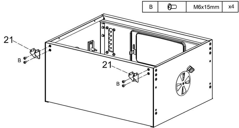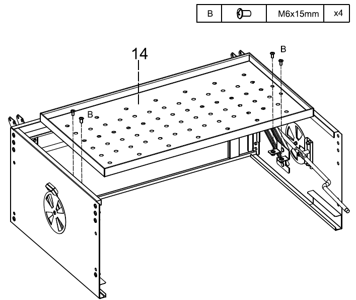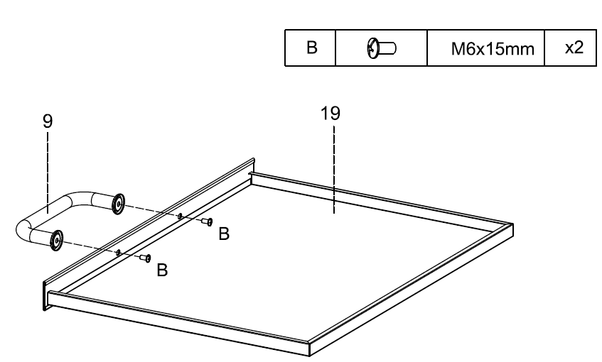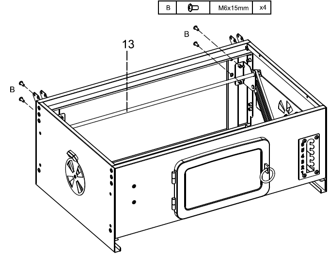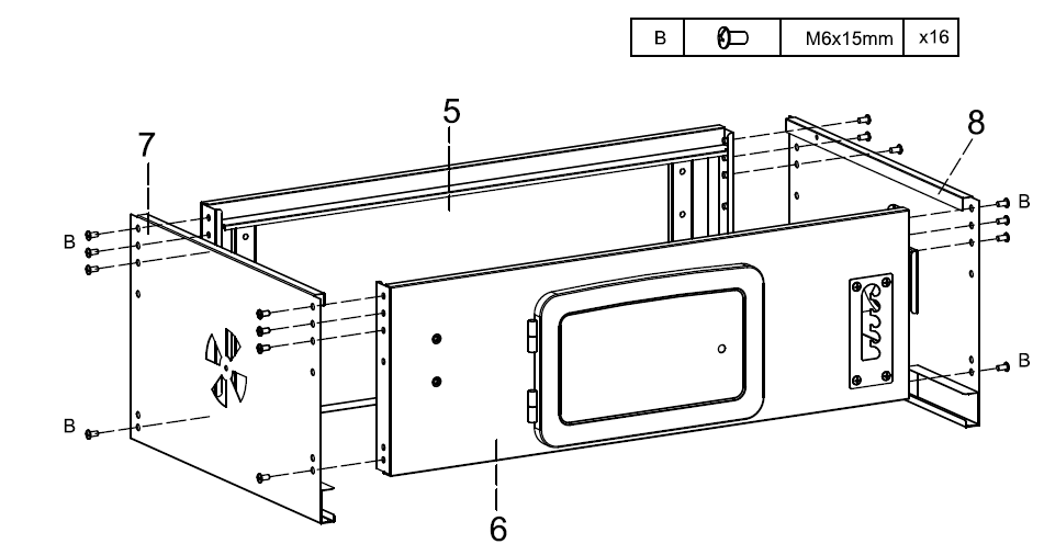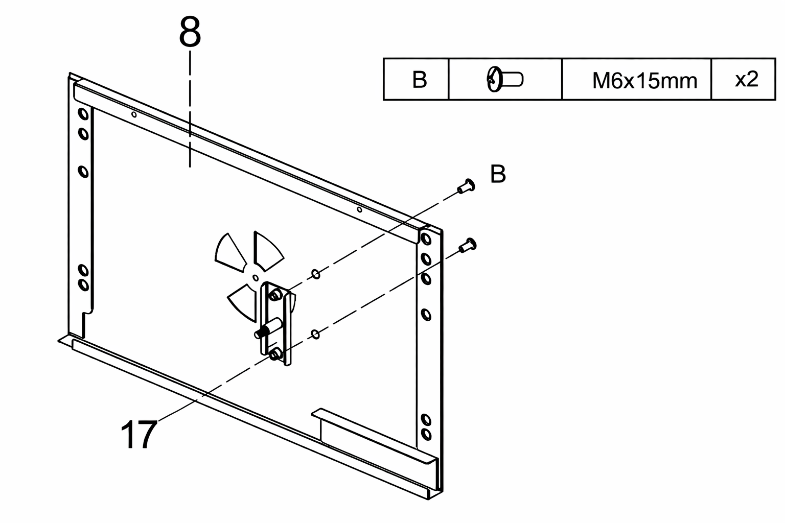 - Attach right hand side panel (Part 8) to the mounting bracket (Part 17) using the bolts (Part B).