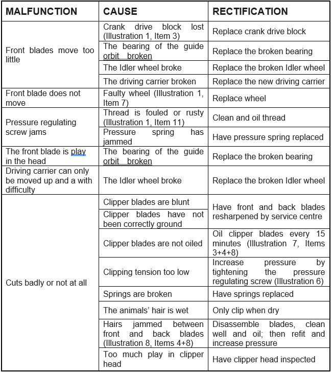 Hair may collect between the clipper blades if they are insufficiently tensioned at the start of clipping. This will have an adverse effect on further clipping progress or make it quite impossible. If this happens, the clipper blades must be disassembled, cleaned, oiled and re-fitted.