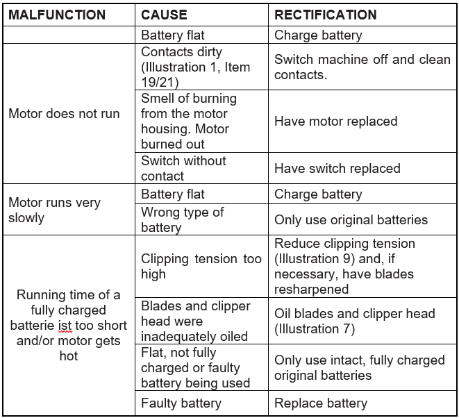 1. The clipping tension has been set too high and/or the blades are insufficiently oiled. Reduce the clipping pressure and oil the blades regularly so that they do not run dry. If you still do not get a satisfactory clip, have the clipper blades resharpened by a specialist workshop. 2. The clipper head is jammed. Remove the blockage. 3. So as to protect the battery from a damaging total discharge, the machine will switch itself off when the battery is flat. The battery must then be recharged. Switch off the machine in the event of 1, 2 or 3. After rectifying the cause, the machine can be used again as usual.