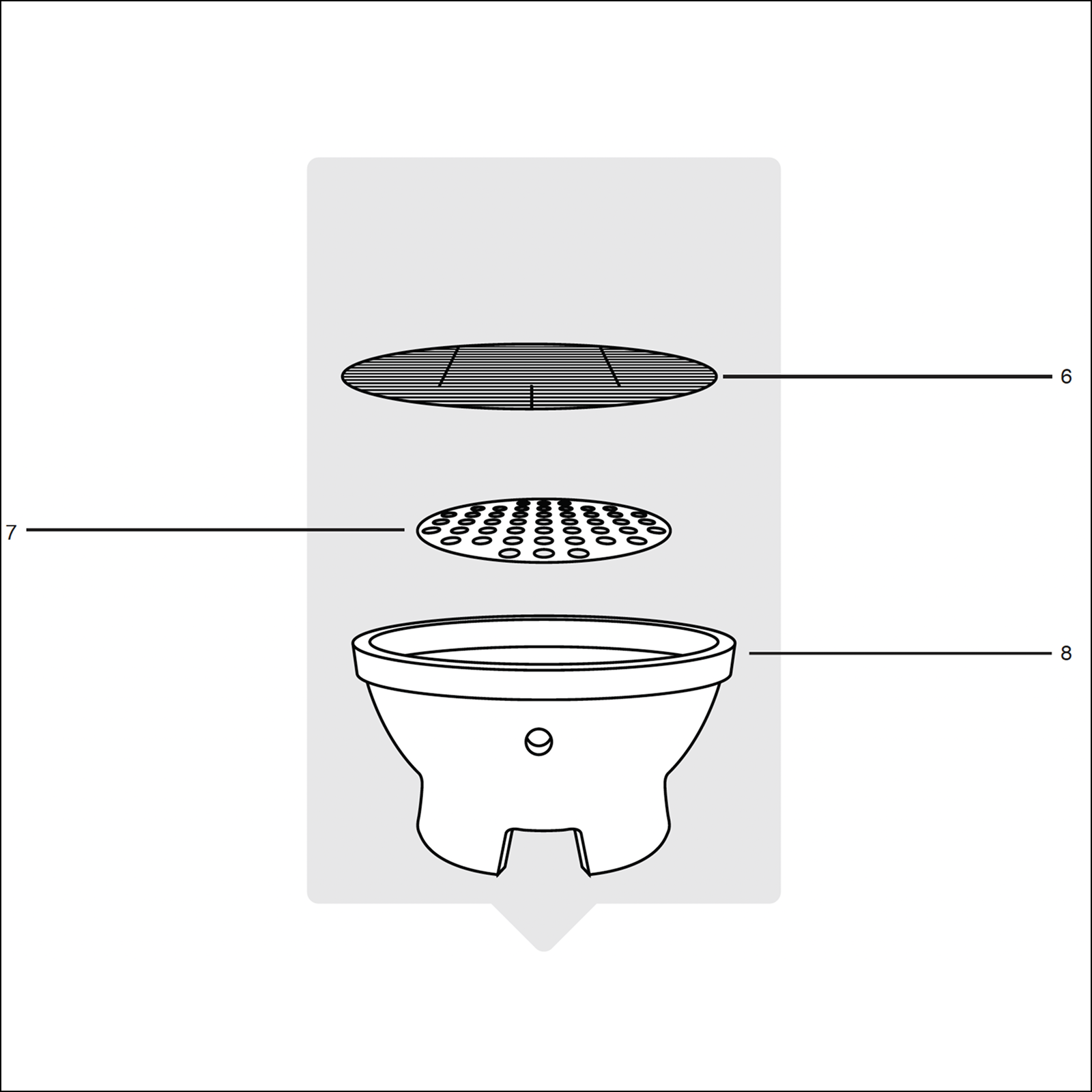 Once the grill is securely placed on the stand, add the firebox (8), charcoal plate (7), and cooking grill (6) inside the Kamado Grill as displayed in the assembly diagram.