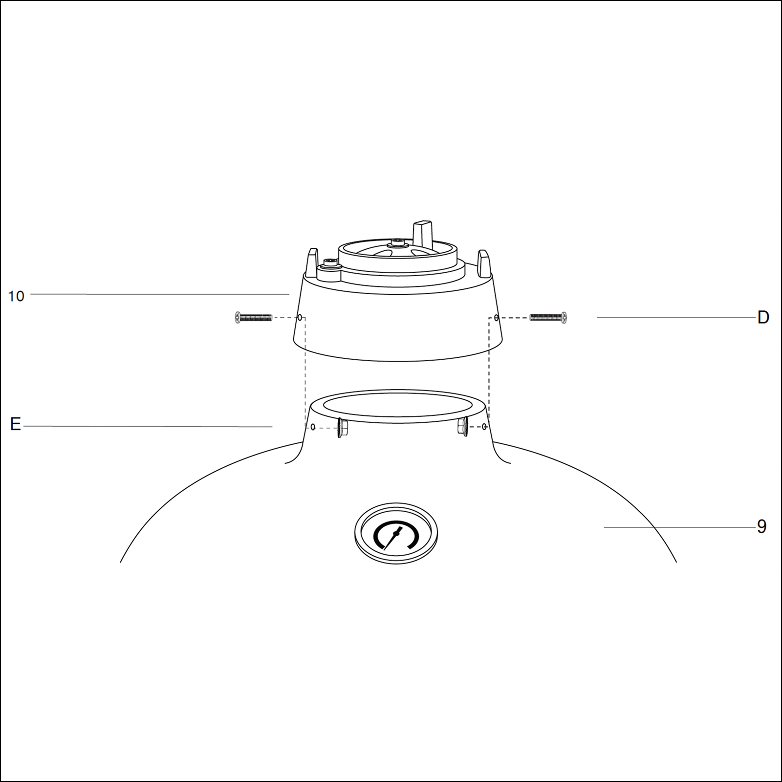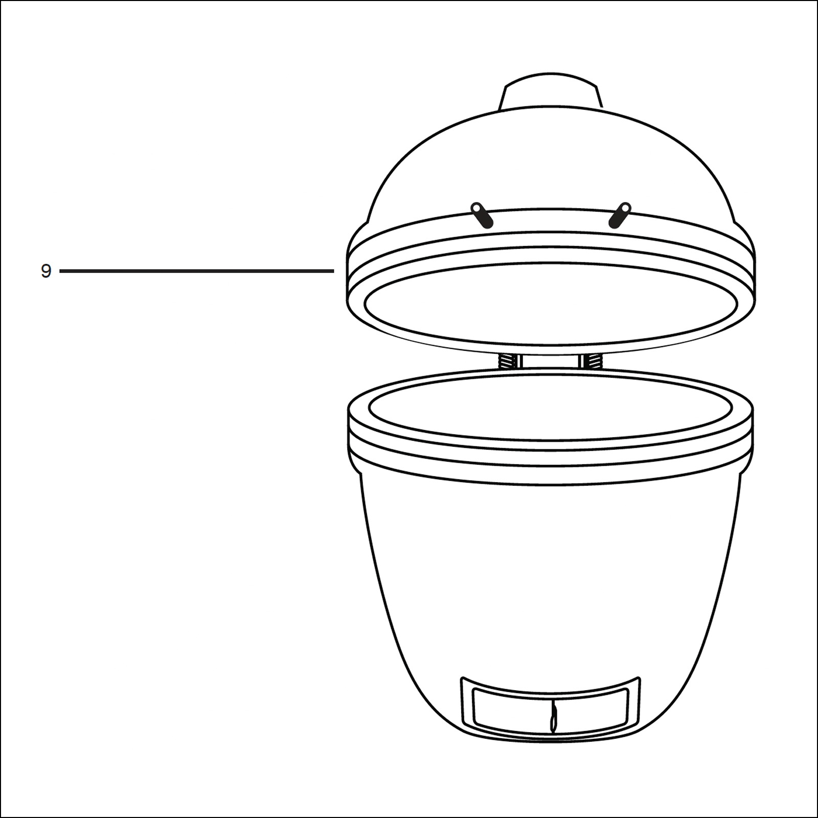 Attach the top vent (10) to the Kamado Grill (9) by placing it on top and aligning both the bolt holes.