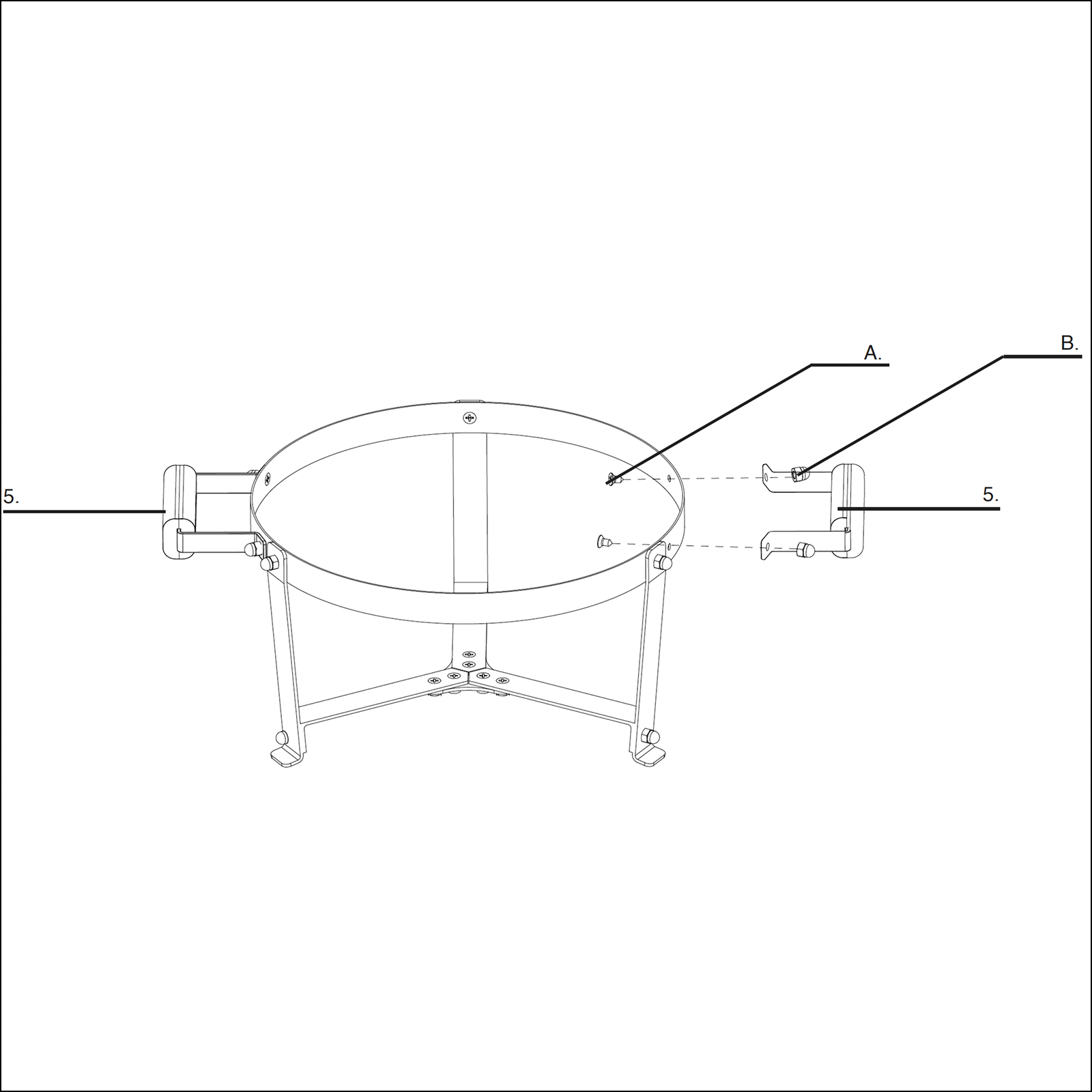 Attach the 2x handle (5) to the lid of the brace ring (1) by aligning the bolt holes of the handle to pre-installed bolts on the lid.