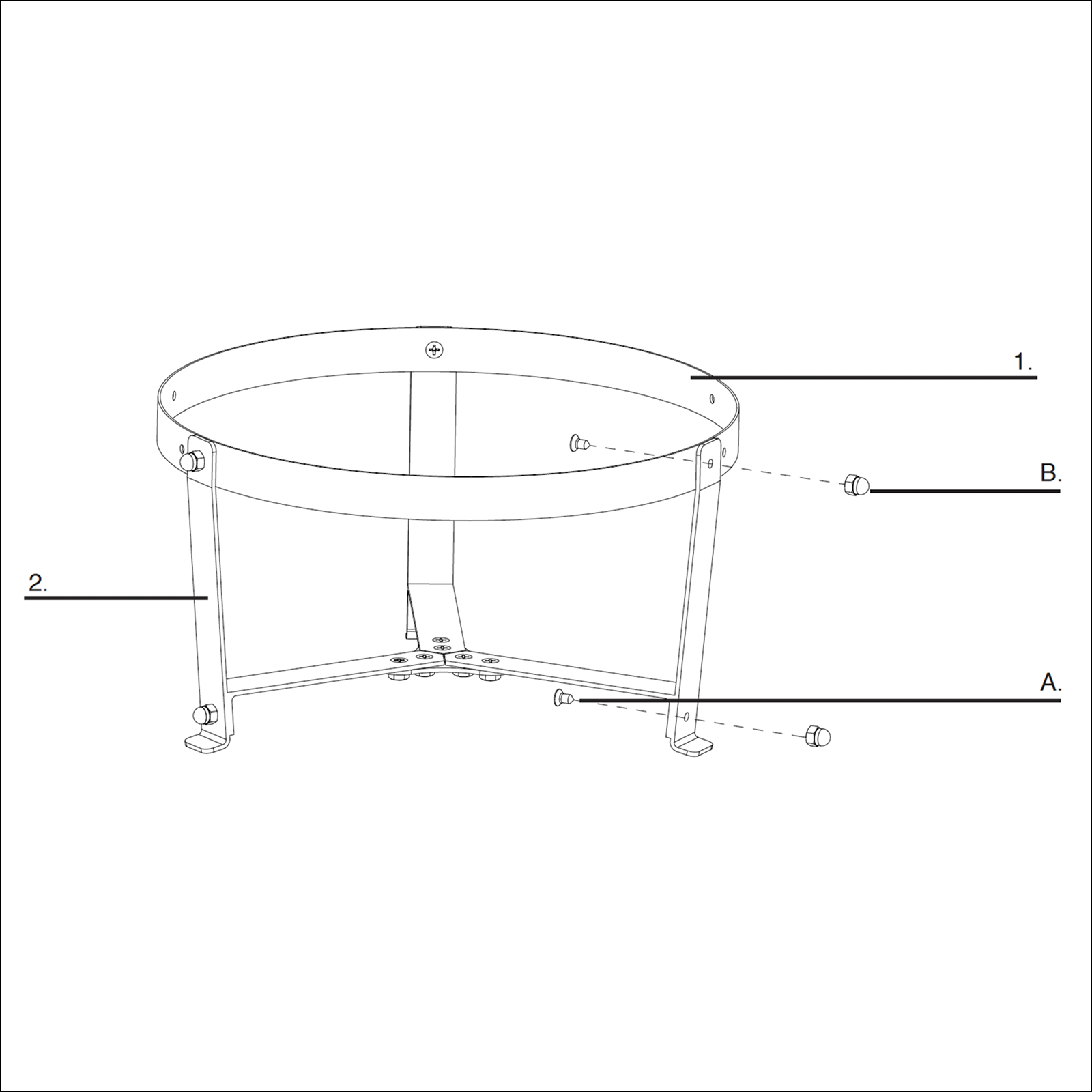 Attach the 3x bracket (2) to the brace ring (1) using the 3x screws (A) with the 3x dome-headed nuts (B).