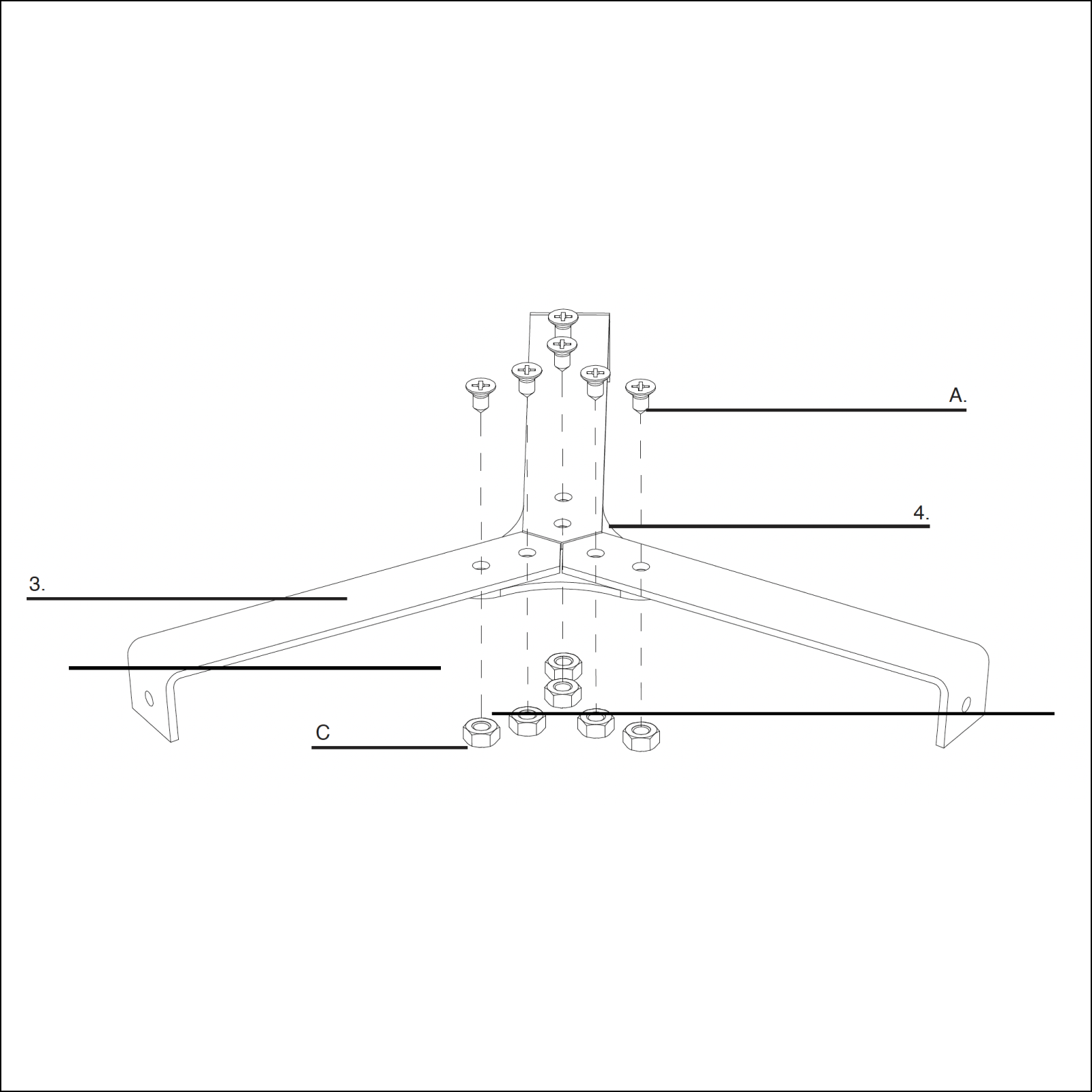 Secure the 3x bracket (3) and triangle connection piece (4) using the 6x screws (A) with the 6x dome-headed nuts (C).