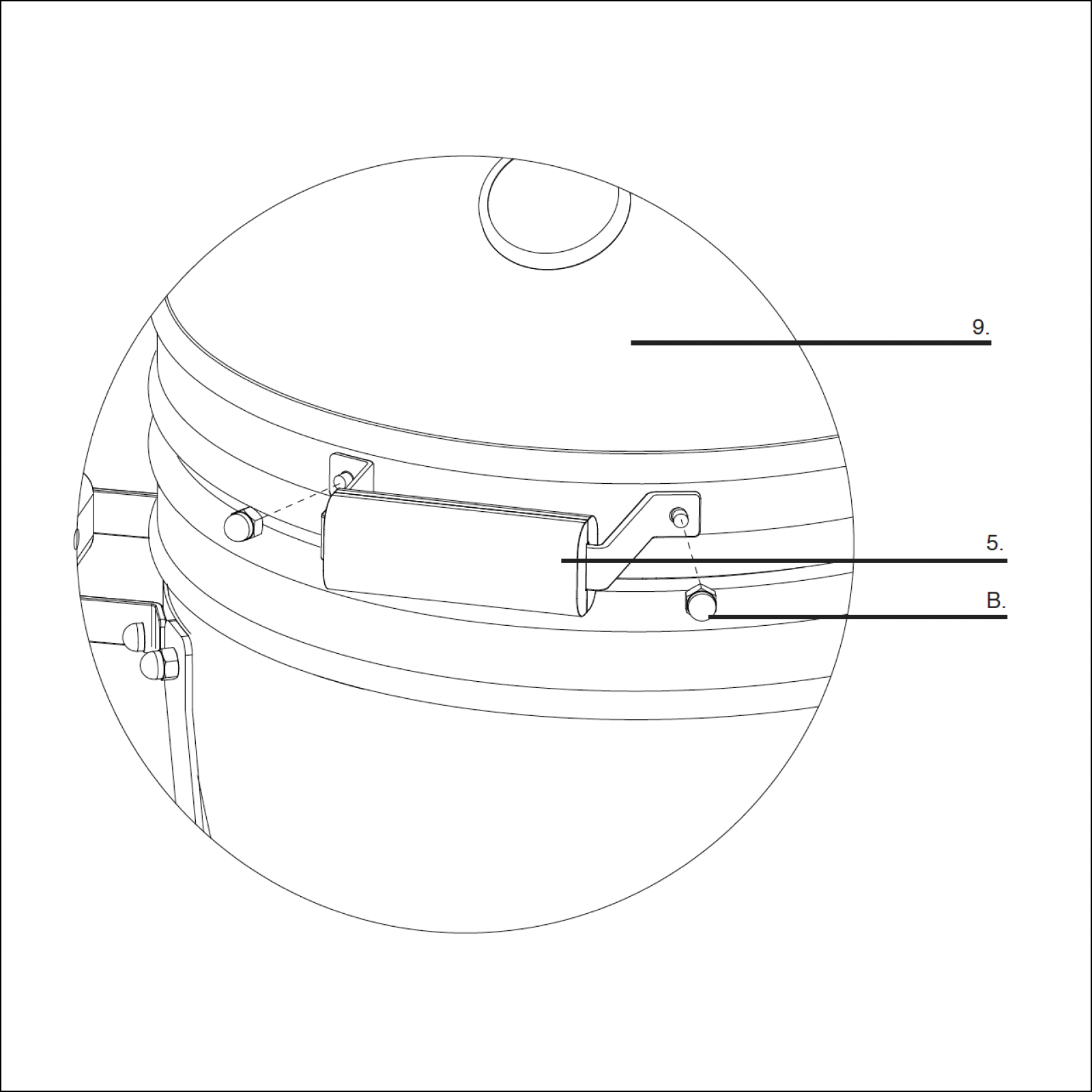 Attach the handle (5) to the lid of the Kamado grill (9) by aligning the bolt holes of the handle to pre-installed bolts on the lid.