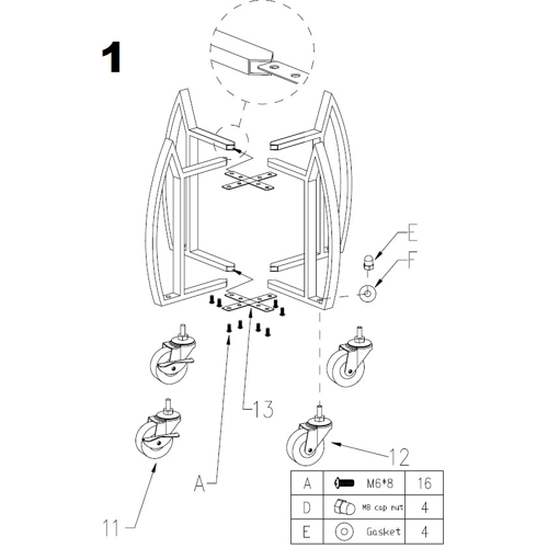 Build the base frame by attaching the Locking Caster Wheels (Part 11), Standard Caster Wheels (Part 12), and Cross Base Braces (Part 13) to the Support Frame Panels (Part 10) using the Screws (Part A & Part B), Nuts (Part C & Part D), and Washers (Part E).