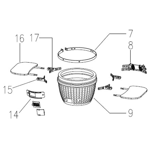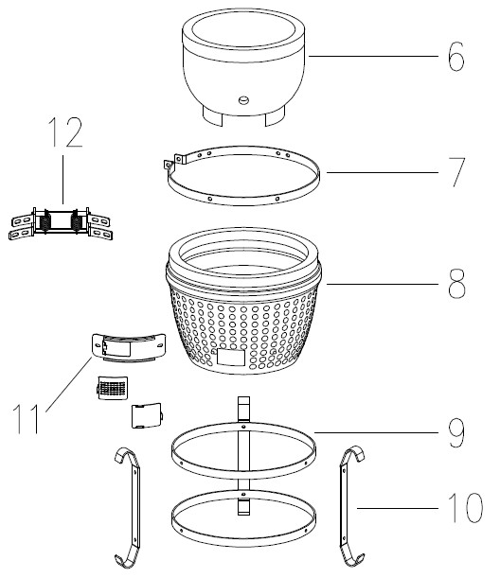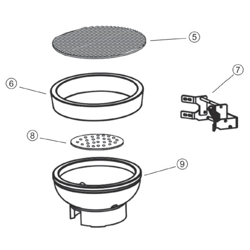 Attach the Hinge Assembly (Part 7) to the Inner Fire Ring (Part 6) and install it on top of the Charcoal Plate (Part 8) and Firebox (Part 9).