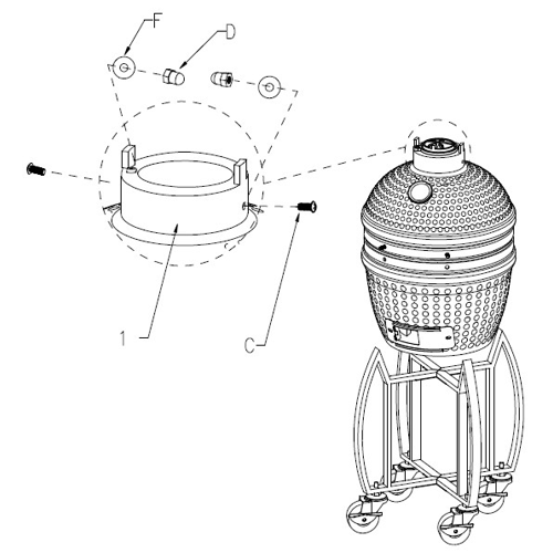 Attach the Top Vent Cap (Part 1) to the top of the Grill Dome (Part 2) using the Nuts (Part C), Handle Brackets (Part D), and Handle Spacers (Part E).