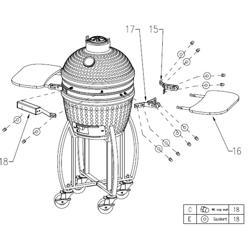 Attach the Hinge Arms (Part 15), Folding Side Tables (Part 16), Side Table Brackets (Part 17), Front Handle (Part 18), and Lower Support Ring (Part 8) to the Lower Grill Base (Part 9) using the Nuts (Part C) and Washers (Part E).