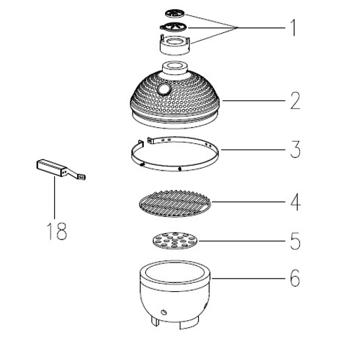Attach the Front Handle (Part 18) to the Upper Support Ring (Part 3), then install the Upper Support Ring (Part 3) on top of the Cooking Grill Grate (Part 4).