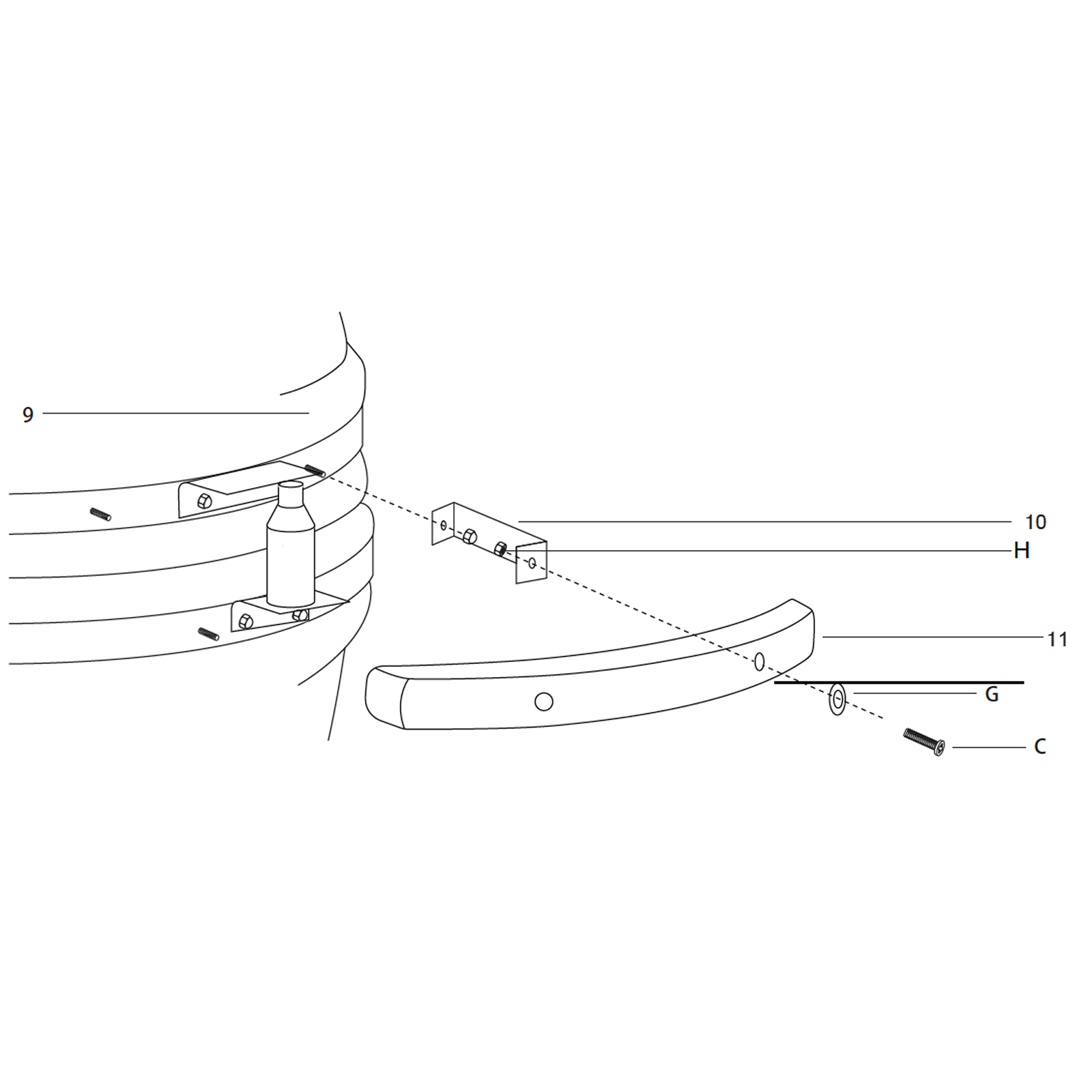 Attach the handle (11) to the brackets (10) using 2 bolts (C) and nuts (H).