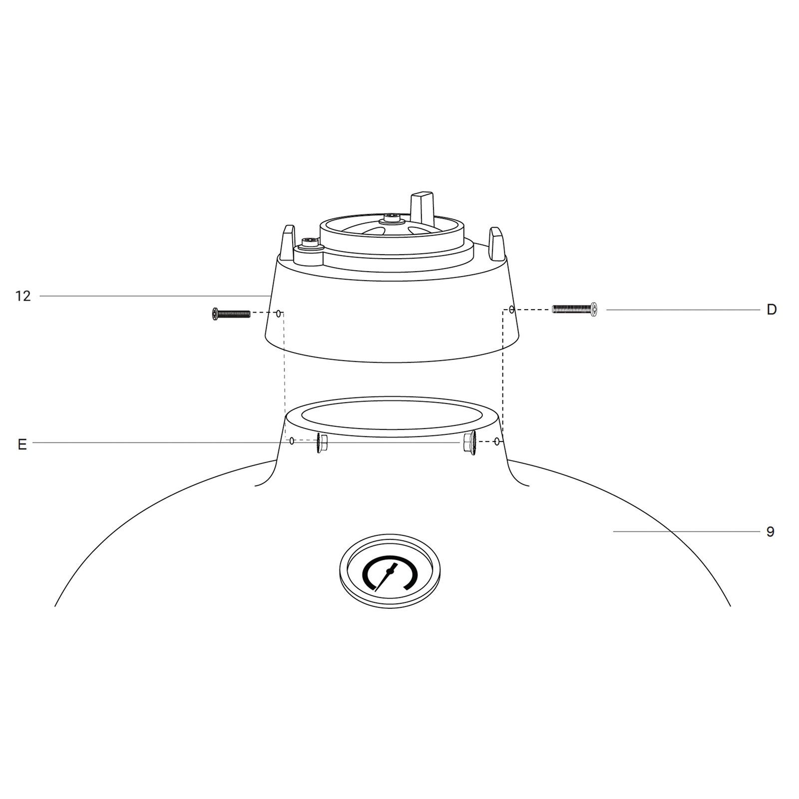 To attach the top vent (12) to the Kamado Grill (9) place it on top and align both the bolt holes.