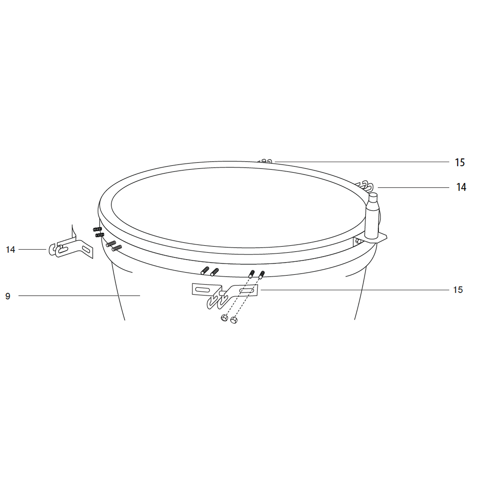 Attach the table brackets (14) to the Kamado Grill using the 4 pre-attached bolts and dome-headed nuts per bracker.