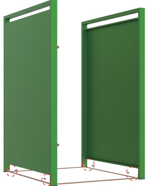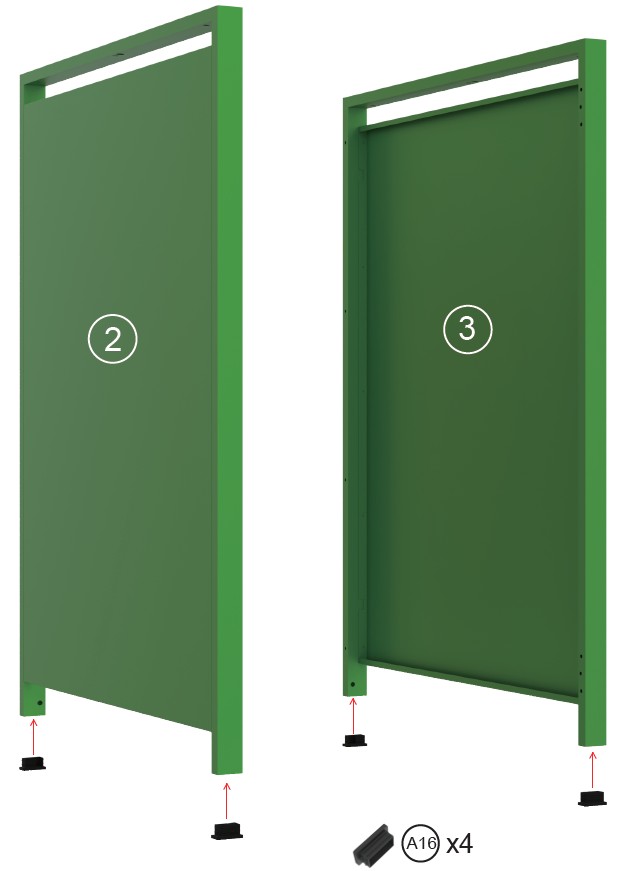 Firmly install Feet (Part A16) to the bottom of Side Panel Left (Part 2) and Side Panel Right (Part 3).