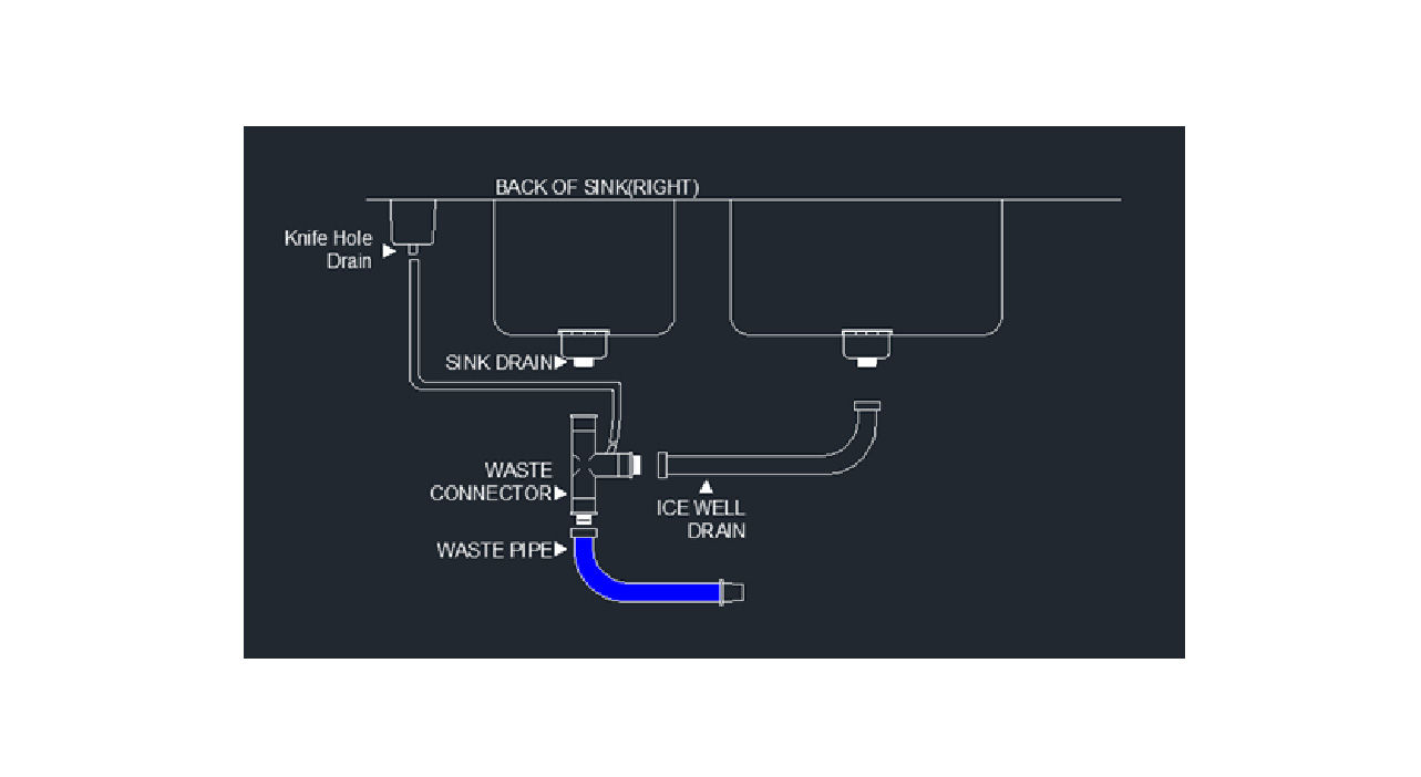 Fit the waste pipe to the bottom of the waste connector to allow for drainage from the Knife Holder, the Sink and the Ice Well.