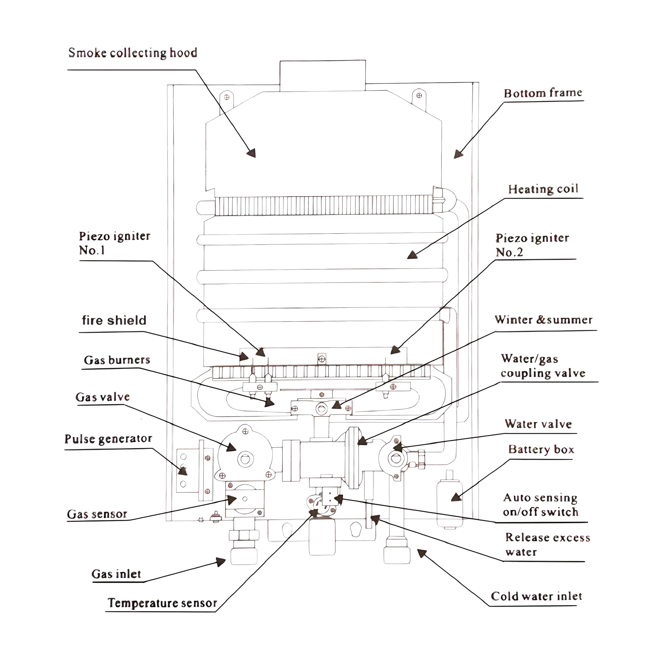 17. Summer and winter button knobRegulate the quantity of fire rows by the use of winter-summer switch. In summer, shut off 1/4 fire rows to save 40% energy. 18.Unsuccessful ignition