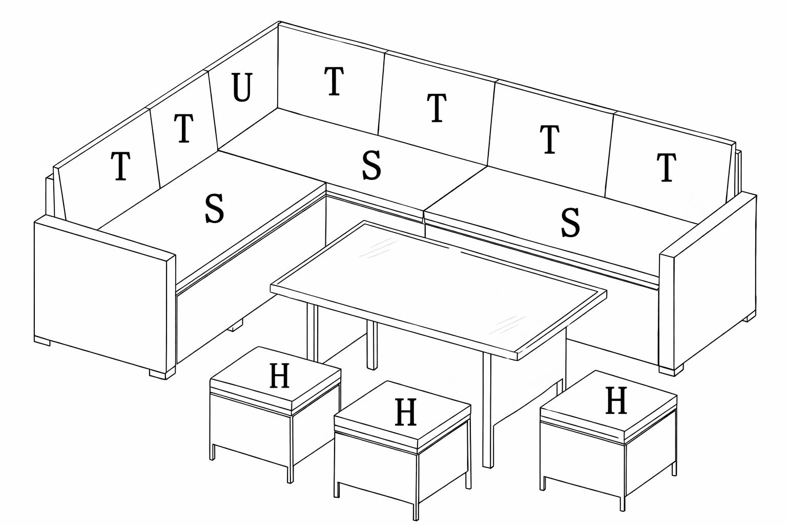 Install the back seat cushions (Part T), the back corner cushion (Part U), the base seat cushions (Part S) and the stool cushions (Part H).