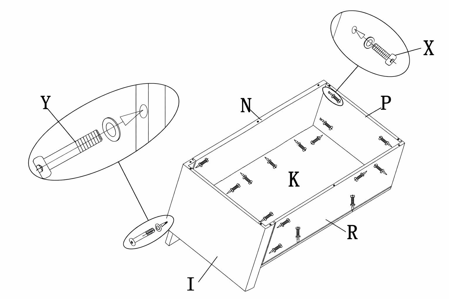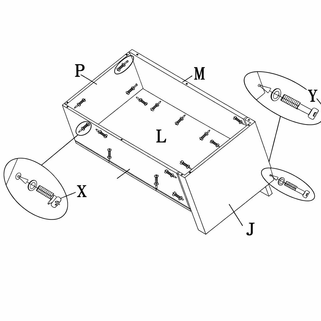 Using the screws and washers (Parts X and Y), assemble together the base seat side panel (Part P), the right side back seat panel (Part M), the right side front panel (Part Q), the left side arm rest (Part J), and the right side base seat panel (Part L).