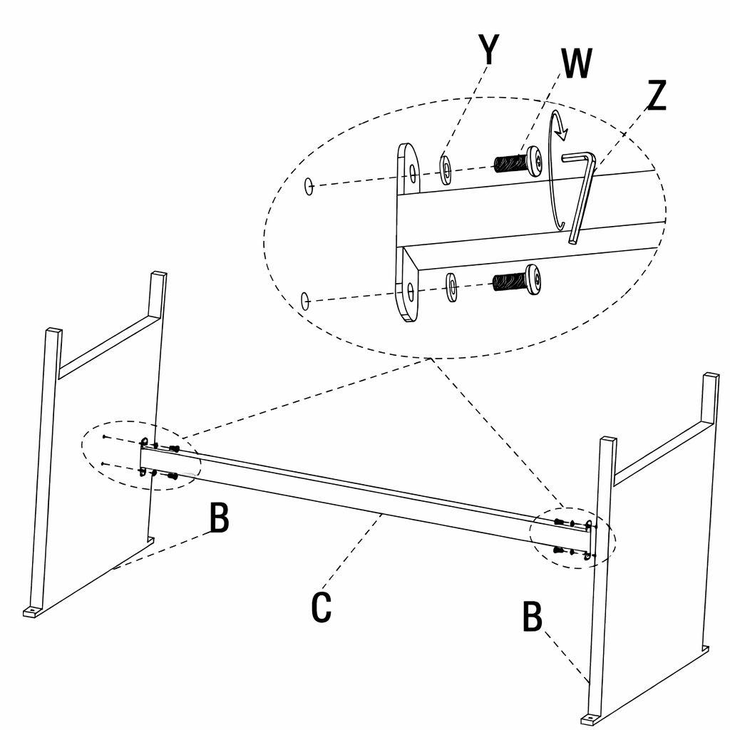1. Place the two table legs (Part B) upright and facing each other. 2. Position the table leg connector (Part C) between the frames, aligning the holes. 3. Insert a bolt (Part W) with a washer (Part Y) through each hole. 4. Tighten the bolts using the allen key (Part Z). 5. Do not fully tighten until all bolts are in place.