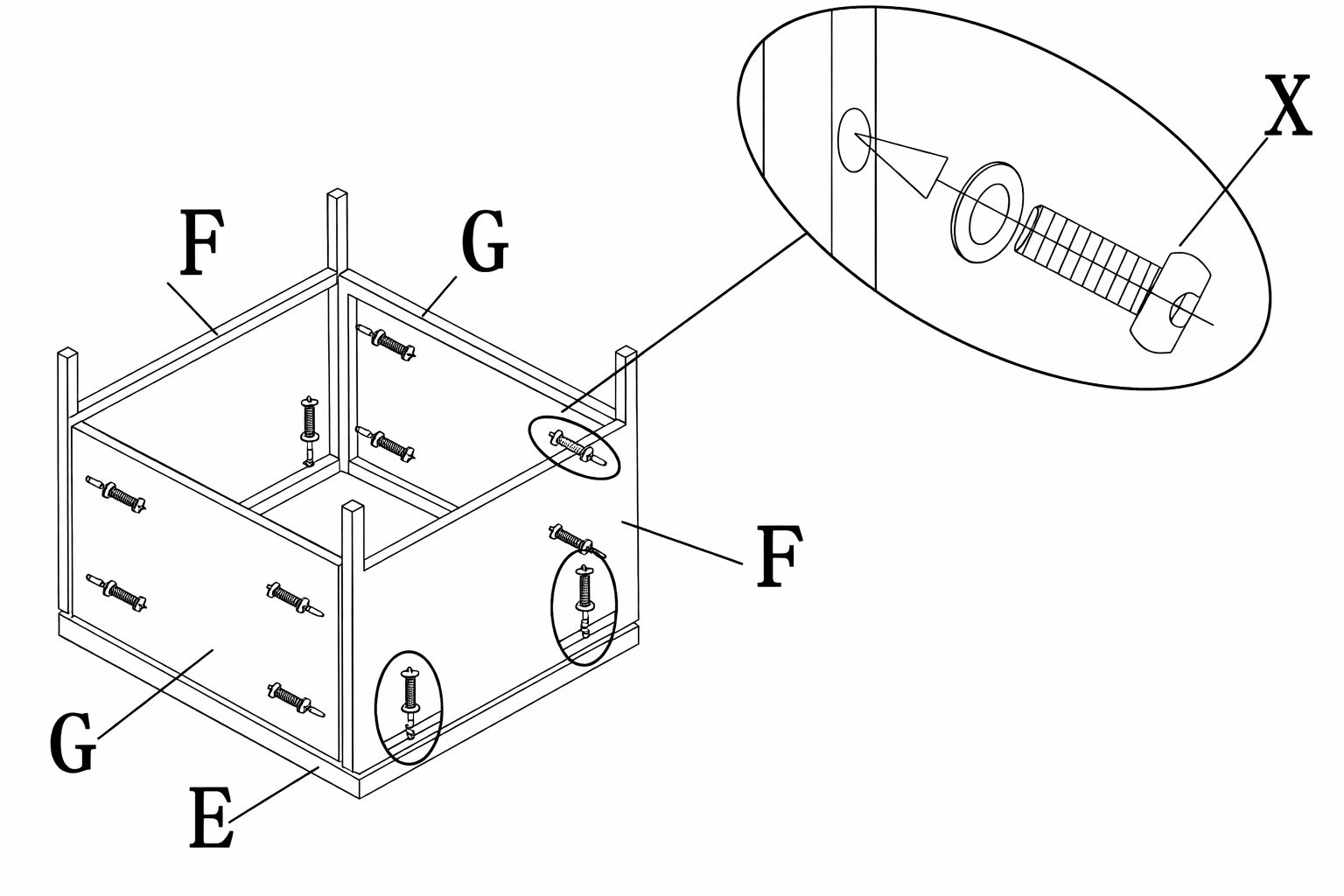 Using the screws and washes (Part X), assemble the stool together by lining up the legs (Part F) and the side panels (Part G).
