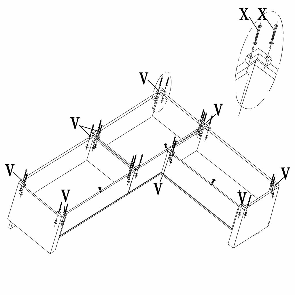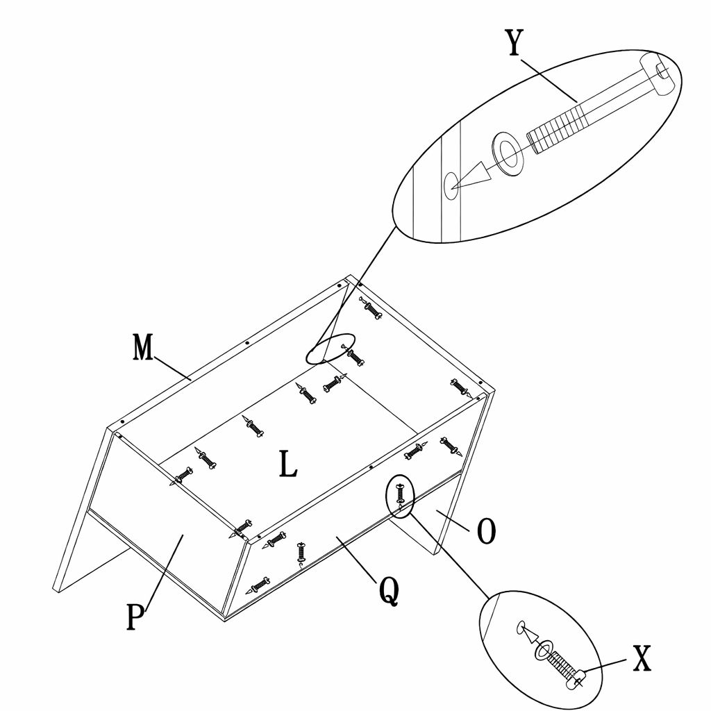 Using the screws and washers (Parts X and Y) assemble together the base seat side panel (Part P), the short corner back seat panel (Part O), the long corner back seat panel (Part M1), the right side front panel (Part Q) and the right side base seat panel (Part L).