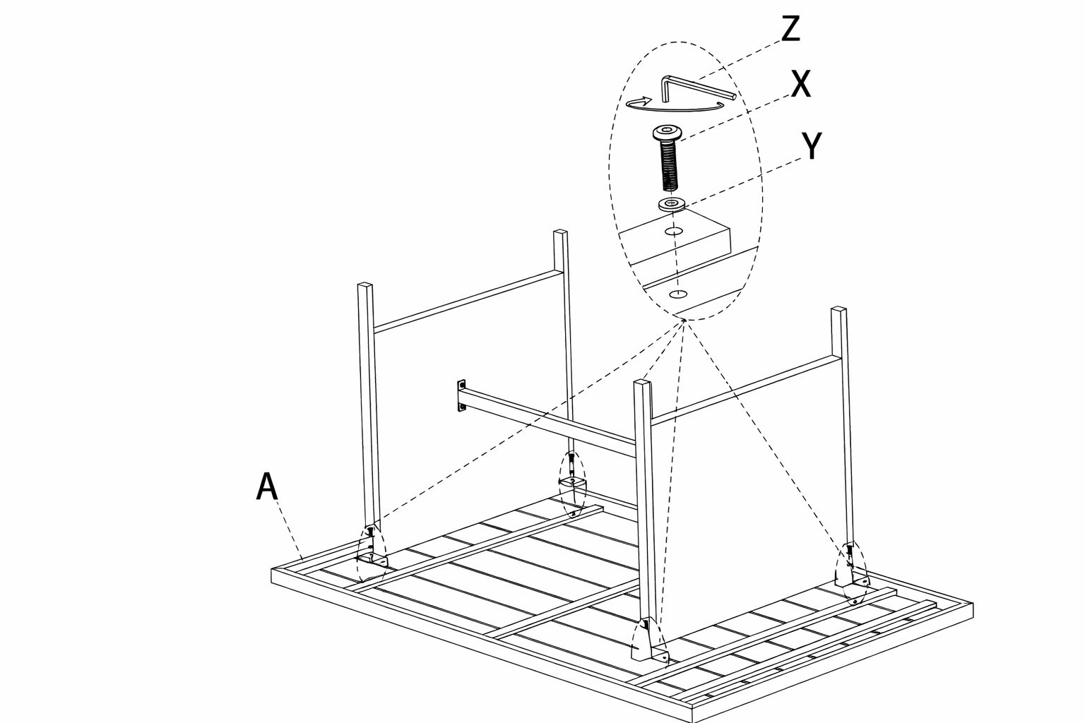 1. Place the tabletop (Part A) upside down on a soft, flat surface. 2. Position the assembled legs and connector on top of the tabletop. Align all holes. 3. Place a washer (Part Y) onto each bolt (Part X). 4. Insert bolts through the frame brackets into the tabletop holes. 5. Tighten using the allen key (Part Z). 6. Tighten all bolts securely once they are all inserted.