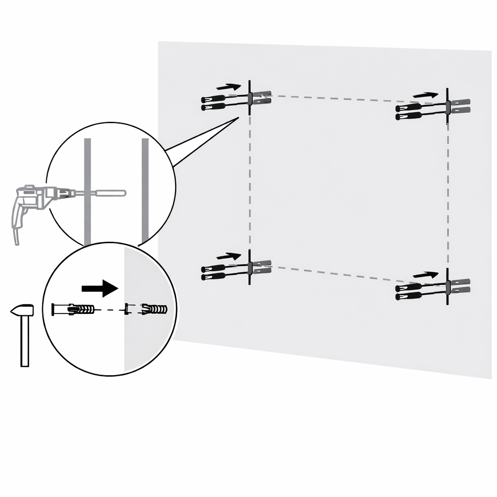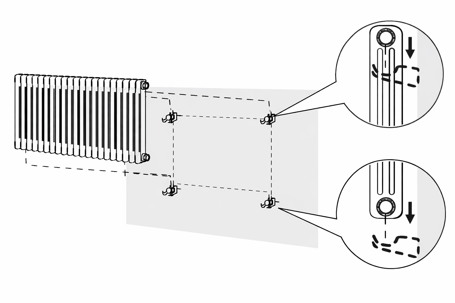* The bottom is approximately 100–150 mm (10–15 cm) above the floor * There is at least 50–100 mm clearance above the radiator (e.g. below a windowsill) * There is sufficient clearance from the wall as per bracket design 3. Step 3 - Drill and Fit the Wall Plugs and Brackets![]() ![]()