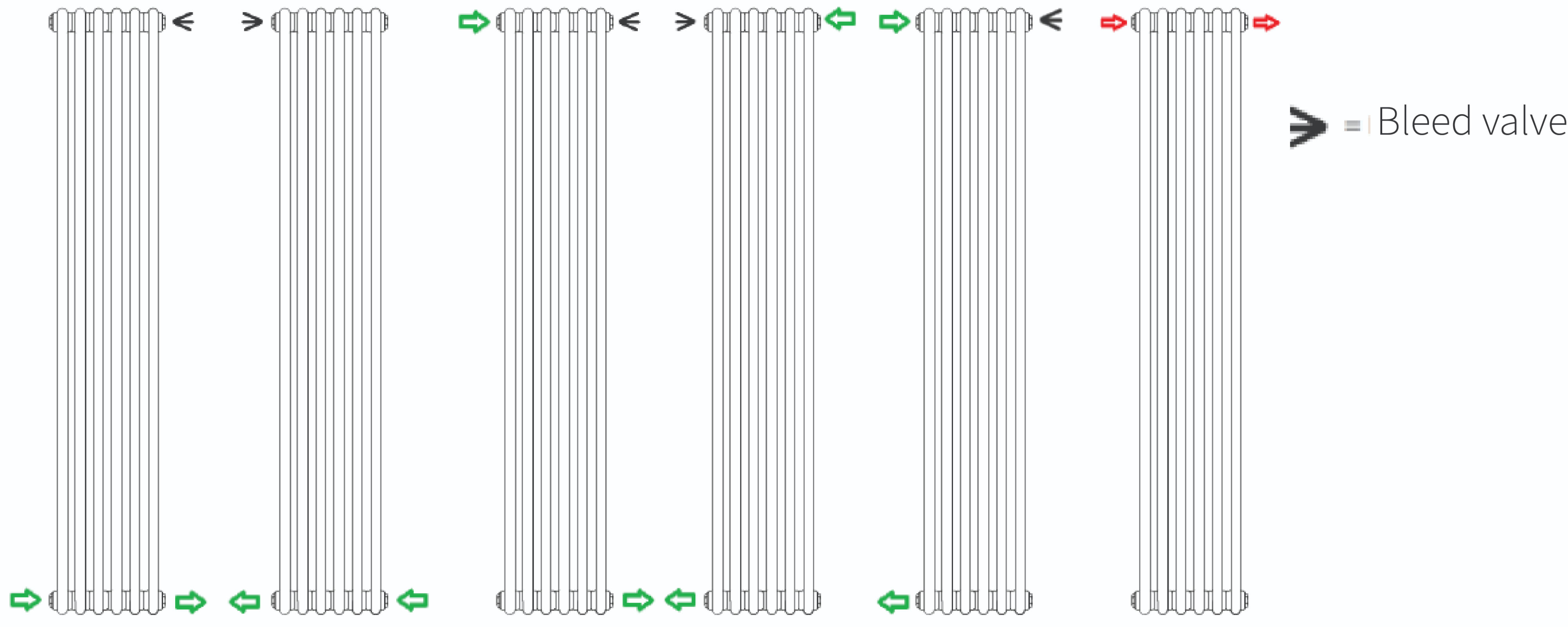 Please ensure the valves are fitted as per the below diagrams. Ensure that a bleed point always remains at the top of the unit. If connecting both feeds to the bottom, it is recommended that a baffle is used. The red cap on the radiator indicates where the flow should come in. Use a wrench to fit the radiator caps on each end.