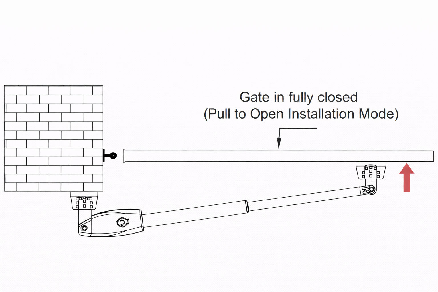 El diagrama esquemático de apertura del cuerpo de la puerta cuando no hay energía se muestra arriba. Por favor, use la llave de liberación manual para aflojar el soporte de la puerta y el brazo del abridor de puerta. Luego levántelo.