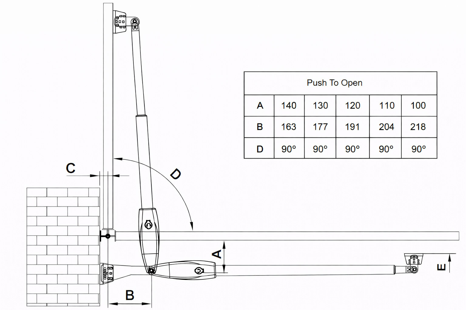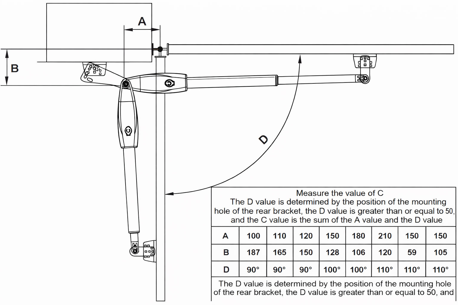 La posición de instalación del soporte es muy importante. Consulte la figura para medir de acuerdo con el ángulo que necesita abrir. Unidad: mm (por ejemplo: A es 150mm, B es 105mm. En este momento, el ángulo máximo de apertura de la puerta es 110°), determine el punto central del eje y márquelo.